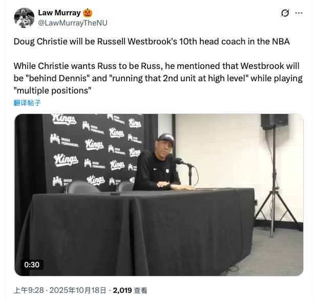 威少近日加盟国王,在新闻发布会上,国王主帅克里斯蒂表示:“我只希望威少做自己,这就是最重要的事情,就是做那个完整的威少。”