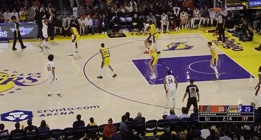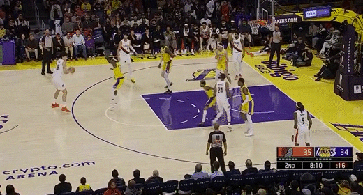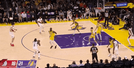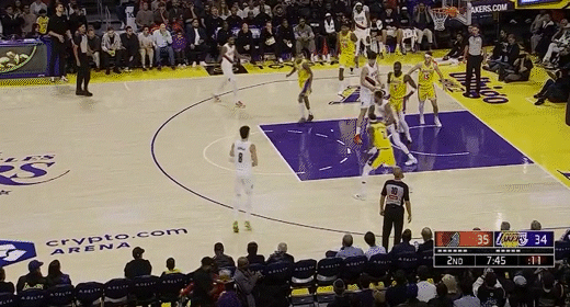 第三节湖人里夫斯拿下9分,开拓者朱-霍勒迪拿下7分,第三节结束湖人77-89落后开拓者